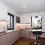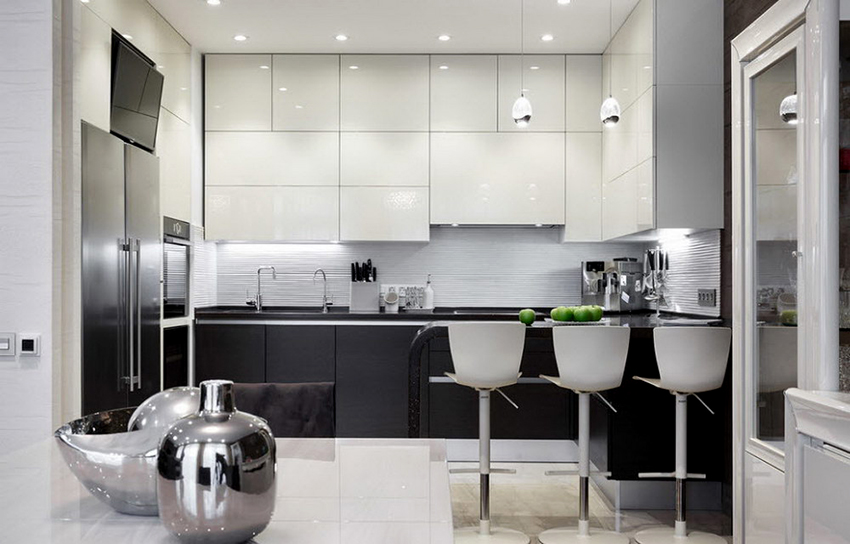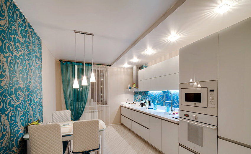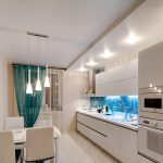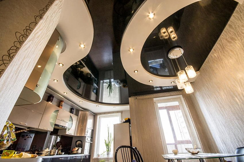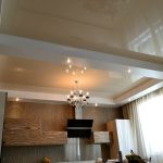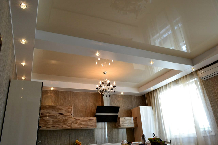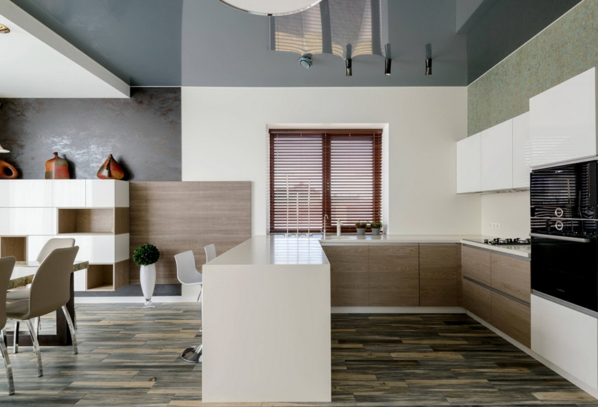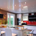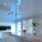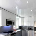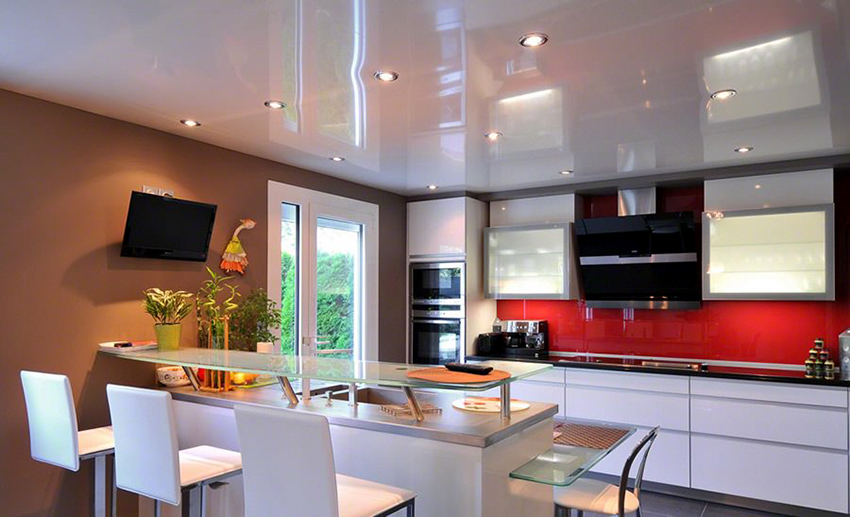Glossy ceilings are not recommended for the kitchen, as dirt is better visible on them, which cannot be avoided