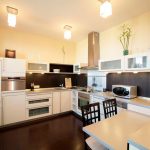 Kitchen space refers to rooms where it is always appropriate to install stretch ceilings. Condensation does not form on the film, the canvas does not absorb any odors, and in case of stains, it is easy to get rid of them with a soft sponge dipped in ordinary soapy water.