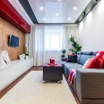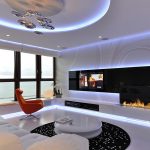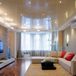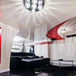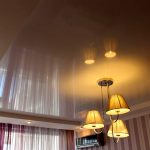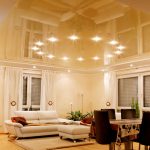 The ideal solution is considered to be LED spotlights, which are not able to heat up and deform the stretch film even after prolonged use in the switched on state. It is possible to distribute small lamps both along the perimeter of the ceiling, in a zigzag manner, and along the contour of the canvas, if it is distinguished by smooth bends. The ceiling, complemented by small lamps, always looks attractive and laconic. At the same time, it is recommended to install control switches so that you can choose the lighting level depending on the time of day or the individual needs of the residents of the room.