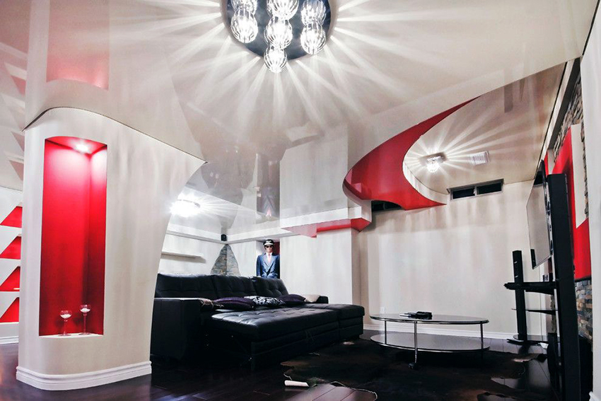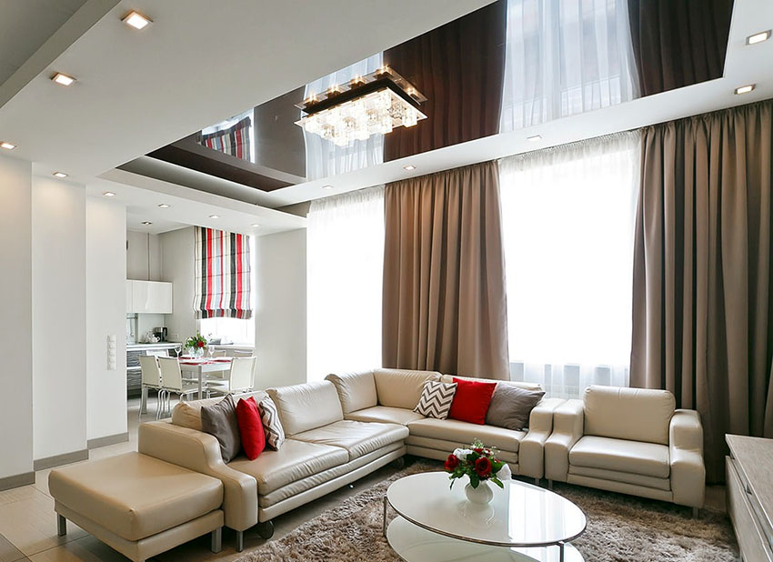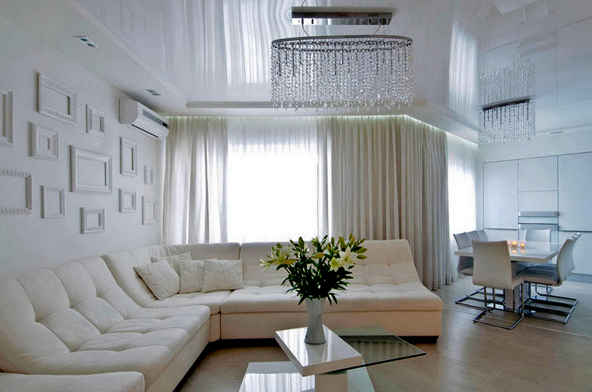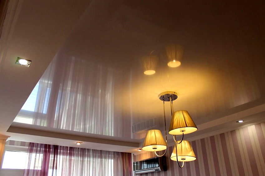 In addition, beautiful stretch ceilings are relatively light: with an area of 30 m², the material together with the fastening system weighs only about 10 kg. But this option, especially when using glossy materials, requires uniform tension, and this can only be done by people with certain experience.