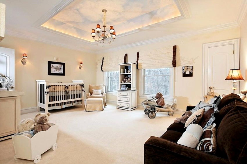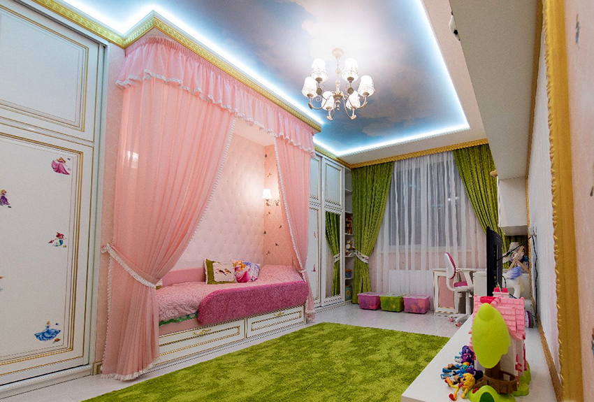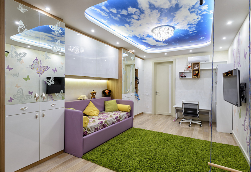 The children's room in any case should be bright and light. High-quality PVC canvases will help create a fairy tale on any ceiling. You can use a solid canvas with photo printing in the room or combine it with drywall. If the child is old enough, he should be involved in the process of creating the ideal ceiling for him.