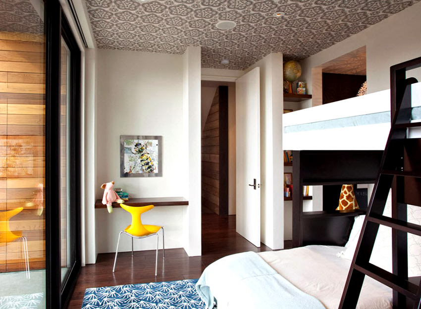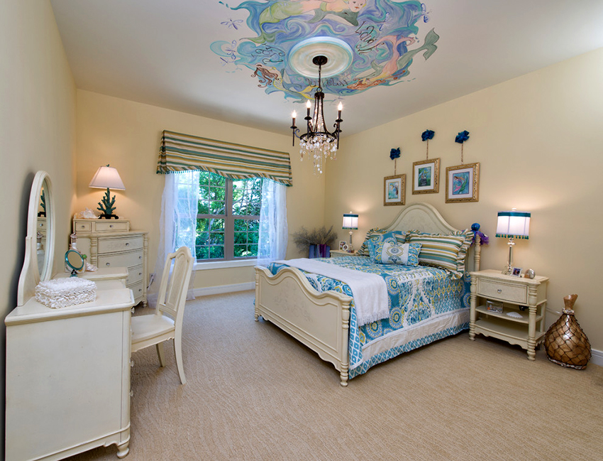 It is best to order a matte stretch ceiling, the cost of which is low, or a more expensive satin canvas with an attractive texture. As for color, most people prefer pastel colors. If you have the desire and courage to experiment, you can make an imitation of the starry sky on the ceiling, favorably emphasized with the help of competent lighting, or choose a canvas with photo printing.