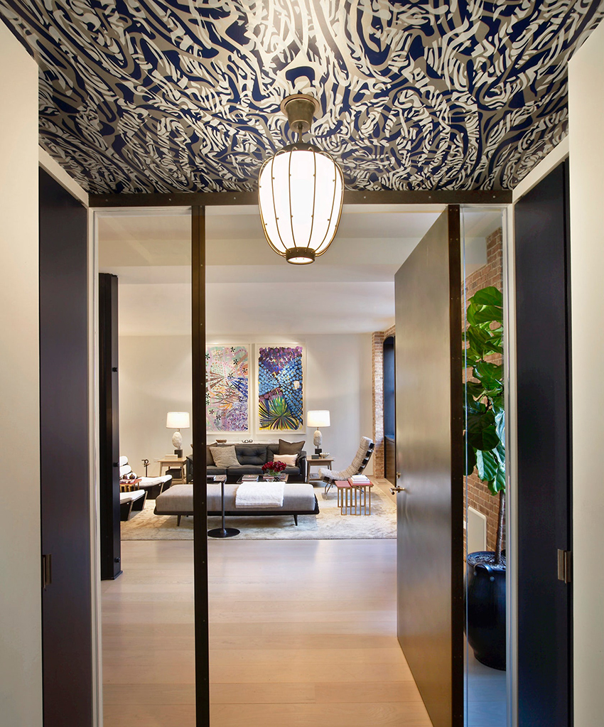 Selection of patterned stretch ceilings and lighting arrangement