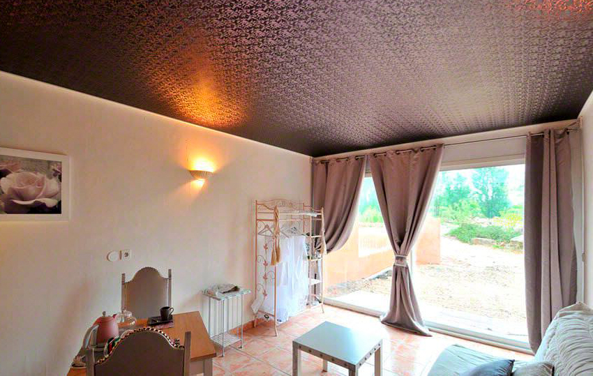 The main advantages of the fabric ceiling are installation without preliminary heating and the absence of seams on the canvas. Due to the large width of the material (from 3 to 5 m per roll), it is easy to find the right size for a spacious room. Another advantage of the fabric ceiling over PVC film is the ability to use the material in unheated rooms, because the peculiarities of production increase the resistance of the fabric to low temperatures. This allows you to decorate with such a canvas ceilings in the country, in the closet or even in the garage.