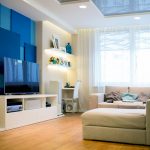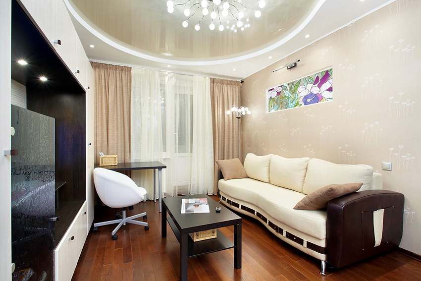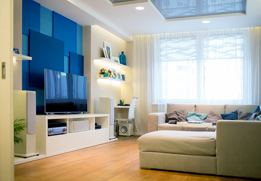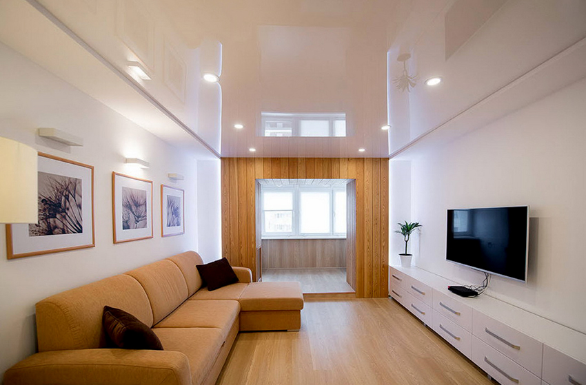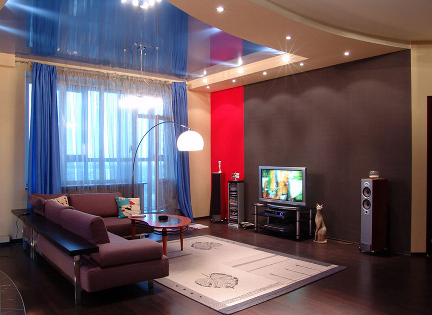 - In a small living room, it is better to arrange a plasterboard frame made around the perimeter, which will be complemented by a glossy white or blue ceiling. The most often seen in the photo are stretch ceilings for a hall in an apartment, imitating a clear sky.