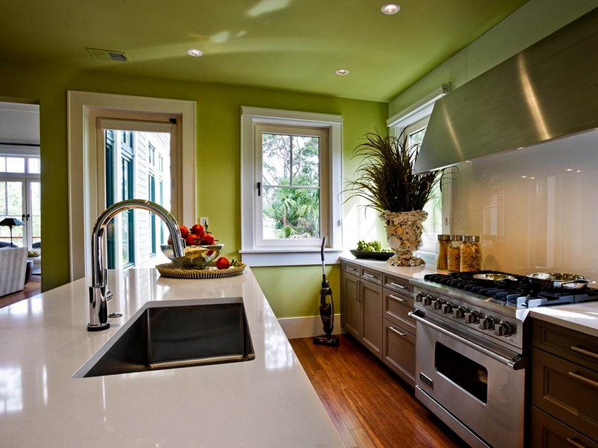 The surface of the kitchen ceiling must be resistant not only to moisture, but also to grease and oil vapors, as well as to high temperatures. It is recommended that the ceilings in living rooms are made of environmentally friendly materials that do not emit toxic fumes into the environment and do not contribute to the accumulation of dust.