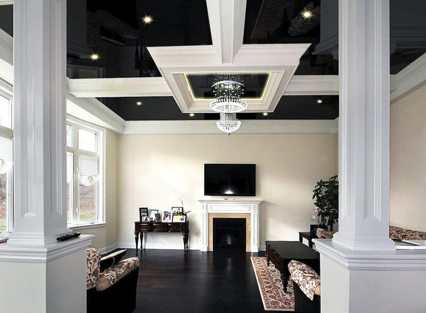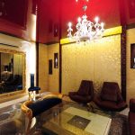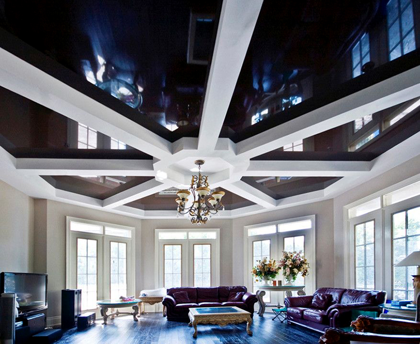 Glossy canvas is recommended for use in rooms that cannot boast of high ceilings. A mirrored surface that reflects the interior will help visually expand the boundaries of the room, make the room light and festive. Regardless of the chosen color of the stretch ceiling, the film beats off artificial and daylight well. For these reasons, it is most often used for various imitations on the ceiling.