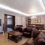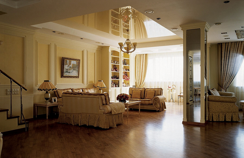 Classics is a direction that will never lose its relevance, because it is a reflection of conservatism and traditions. When creating such an interior, it is appropriate to make monochromatic white ceilings with imitation of stucco, Venetian plaster, natural wood or stone. In addition to white, brown, beige and ivory are popular. In this case, you can use a fabric stretch ceiling, which is complemented by arches, bay windows or columns.
