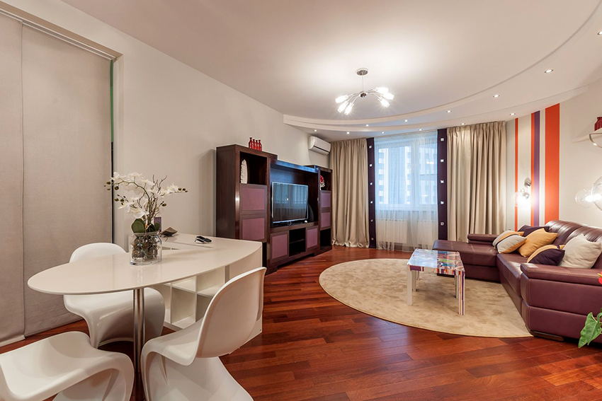 - Fusion. A modern style that favors creative ceilings. A variety of transitions, arches or bends are often found here. It is permissible to order ceilings of unusual colors, as well as with photo printing.