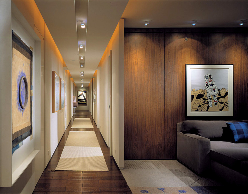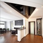 The hallway and corridor usually cannot boast of large dimensions, as a rule, these are cramped rooms of a small area. Therefore, the best option in this situation is to install a mirrored glossy light ceiling that can reflect light and visually increase the space. To make a cramped room look more spacious and comfortable, the color of the ceiling should be several shades lighter than other surrounding surfaces. You can double the effect with built-in spotlights.