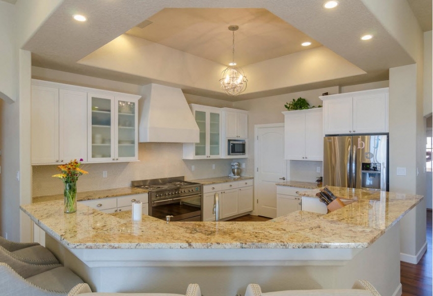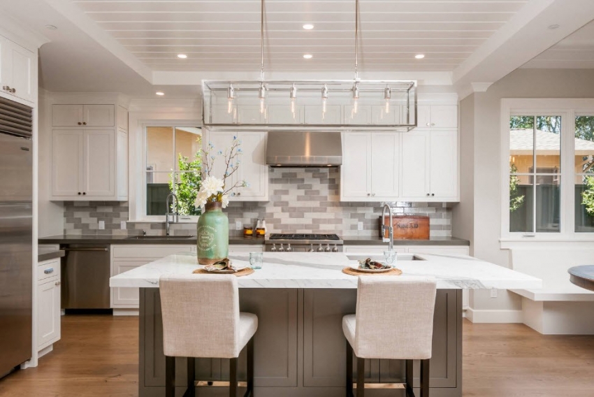 For example, if there is a need to make a suspended ceiling in the kitchen, the area of which can accommodate the cooking area, as well as the dining room. In this case, separation can be achieved by placing the ceiling covering at different levels, some color schemes, as well as the specifics of the location of the lighting.