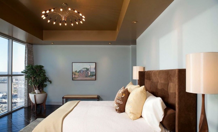 - decorative plaster is one of the most sophisticated, albeit not easy to execute, methods of finishing the ceiling surface. Looking through the photos of false ceilings for the bedroom, you can be convinced of the variety and beauty of the existing options;