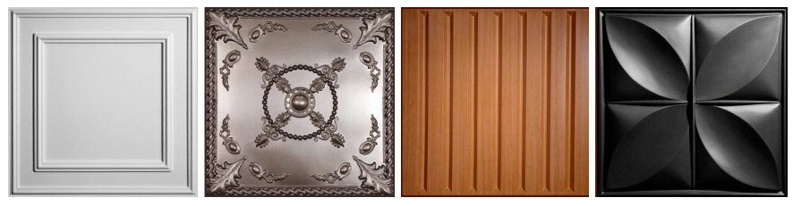 Foam ceiling tiles in most designs are square. The sizes of the squares are 500X500, 250X250 or 300X300 mm. Sometimes there are rectangular specimens 1000x165 mm, which are called panels and are used for finishing public non-residential premises. There are tiles and other geometric shapes, even irregular ones. From it you can upload whole compositions of various topics.