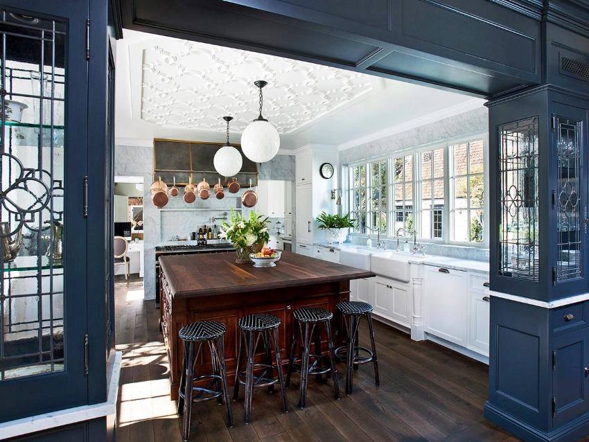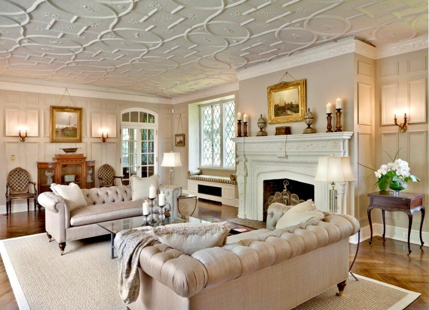 The use of foam tiles for finishing the ceiling allows you to make a very inexpensive and high-quality renovation of the premises. Additional elements in the form of skirting boards and sockets for a chandelier will help to give the interior with such a ceiling a more attractive and finished look. Moldings and columns will further highlight its features.