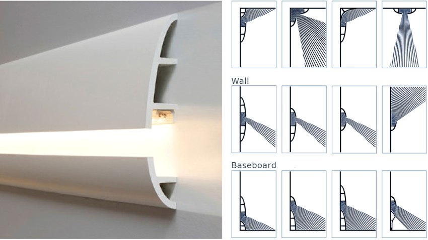 If you decide to decorate the room with a backlit skirting board, you must take into account some features. So, for example, you can give preference to the option of fillets, which in shape resemble a metal profile. This will allow you to place inside not only led stripsy, but also any other light sources such as neon tubes.