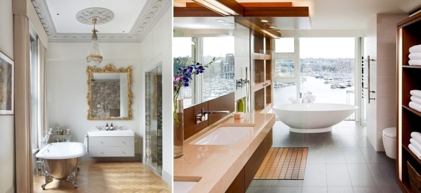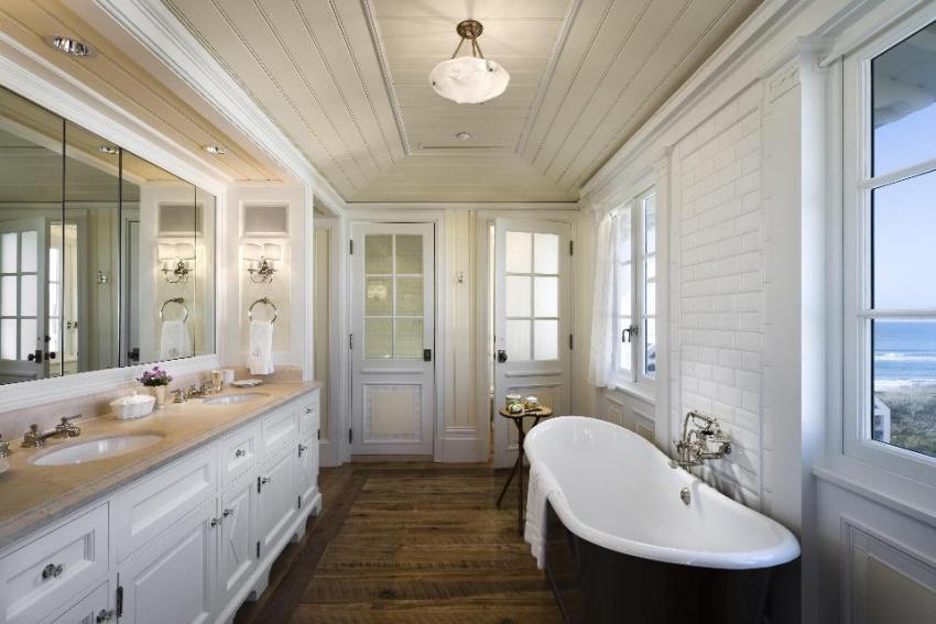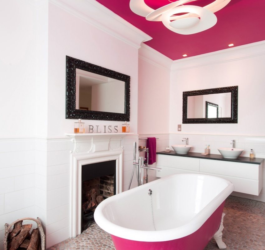 On the practical side, the painted ceiling in the bathroom is not very convenient. Photos of such surfaces, although they sometimes look very dignified, do not particularly attract the attention of potential consumers.