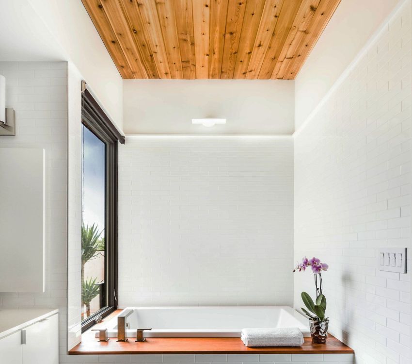 When solving the problem of choosing a material for the ceiling in the bathroom, many stop at polyvinyl chloride panels. They have sufficient strength for this purpose and excellent moisture resistance. Their installation is within the power of even a not very experienced owner and does not require special tools. At the same time, PVC panels look quite interesting, and there is no need to finish them additionally. Such a coating can be simply wiped with a cloth. But most importantly, original and beautiful can be built into such a ceiling Spotlights.