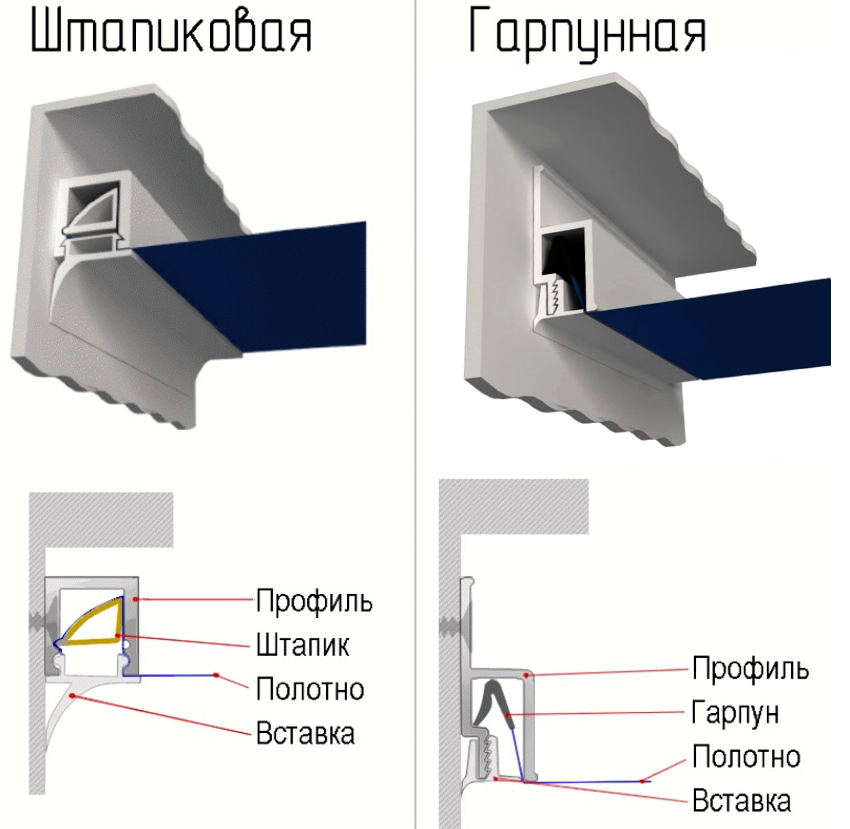 As mentioned above, fastening a stretch ceiling to a wall or to a ceiling is a difference in the place of fixing the frame. There are also several ways that differ in the mechanism of fastening the canvases in the profile: