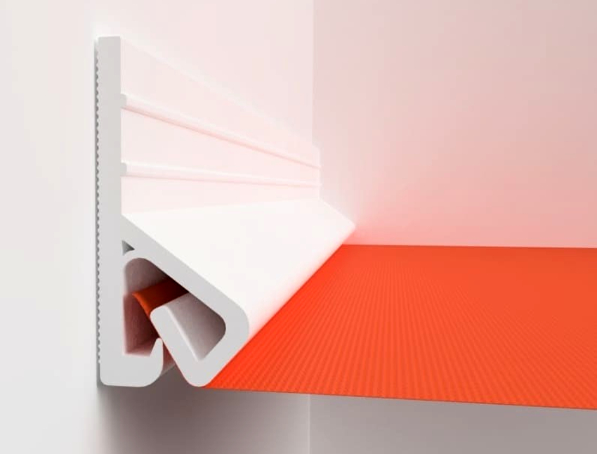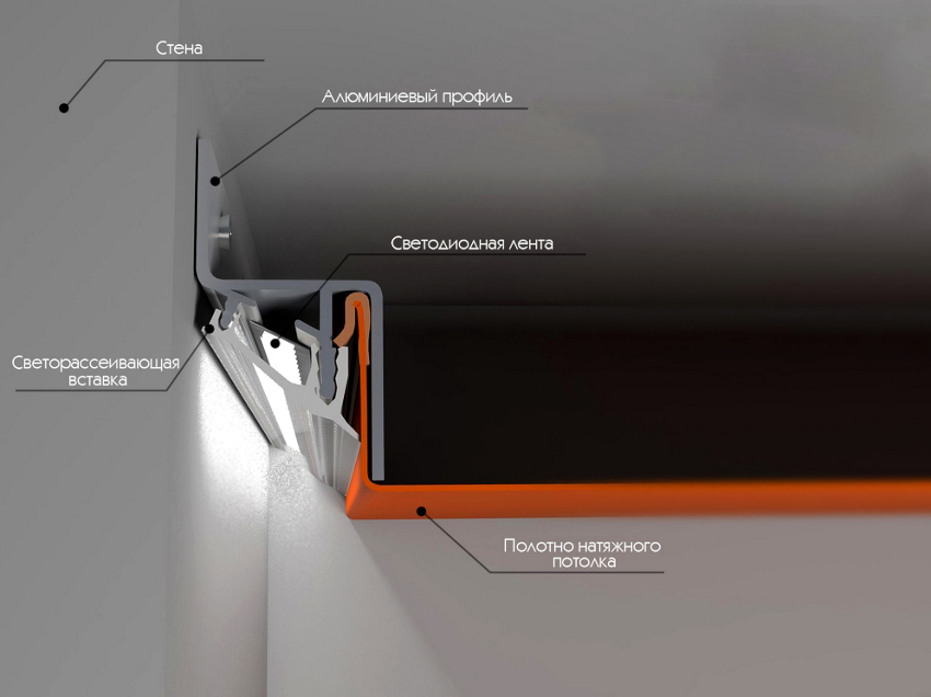 Profiles for backlit stretch ceilings can be used differently. To create lighting between the levels, use the NP-5 option. The canvas is fastened in it using a harpoon method. The profile has a special groove in which the LED strip fits.