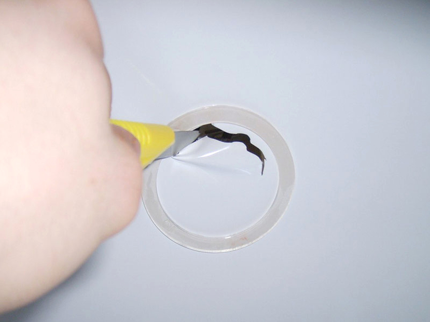 Applying a patch from the front. Usually the applique is made from the same material as the canvas. The adhesive is applied to the patch. It is necessary to ensure that its excess does not protrude beyond the edges, otherwise this will greatly spoil the appearance of the ceiling. After application, the pressure should also be performed carefully - evenly, without chaotic pressing, otherwise wrinkles may appear on the surface.