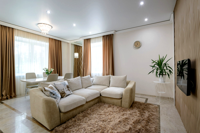 - Pastel cream, beige or light brown tones are also universal, they will be a great addition to the classic interior. They are more often installed than white ones, because it is much easier to wash cream-colored stretch ceilings at home.