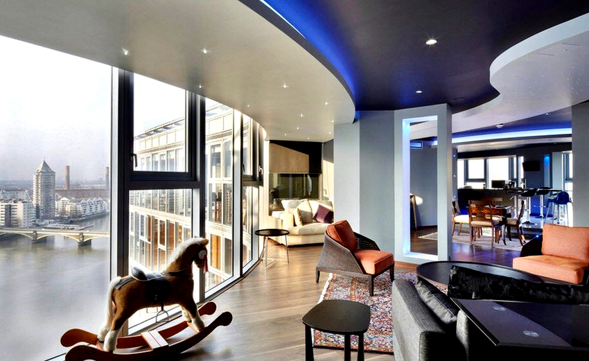 Thus, the mirror shine is able to expand the volume of the room, so for a small room the choice of a glossy ceiling is optimal. Smooth canvases are actively used in the design of interiors in a modern high-tech style, which is characterized by the placement of mirror and glossy surfaces.
