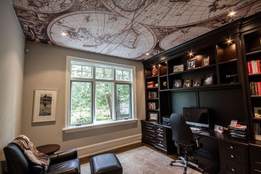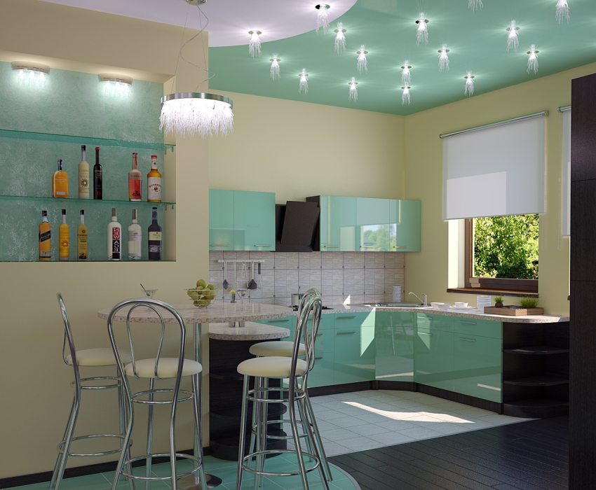The lighting of any room depends on the correct location of the stretch ceiling fixtures. A photo accommodation options demonstrate the positives of each. For example, a kitchen needs brighter lighting for the workplace. Therefore, additional point light sources should be placed near the walls where the hob, sink or cutting table are installed. Basic lighting will be sufficient for the dining table.