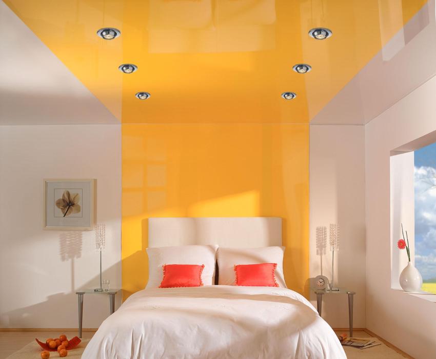 The bedroom does not require the installation of powerful light sources. Here it is enough to illuminate the corners with several spotlights for stretch ceilings. Photos of bedrooms with this type of lighting, complemented by a couple of small sconces, demonstrate the warmth and tranquility of the room.