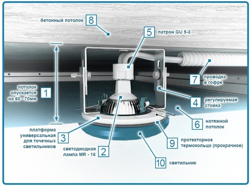 - due to the lack of ventilation between the rough stretch ceiling, such lamps can get quite hot, therefore, only energy-saving lamps or made of LEDs are allowed.