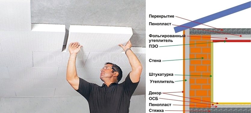 Warming of the ceiling area from the attic side is carried out by laying heat-insulating material over the ceiling or inside its voids (if any).