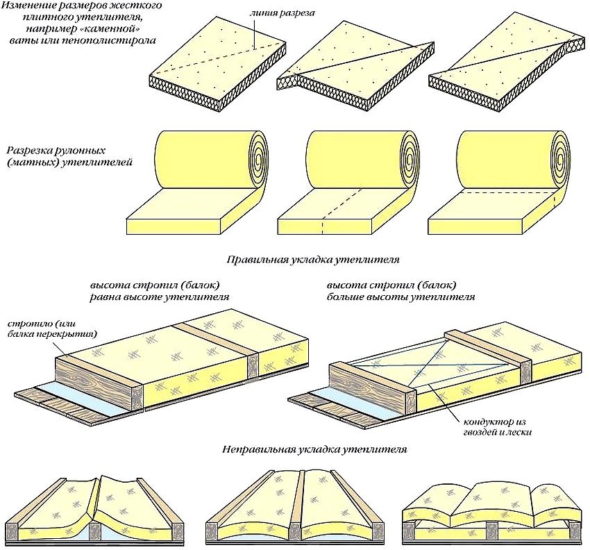 Diagram of cutting insulation of different shapes, as well as examples of correct and incorrect material laying