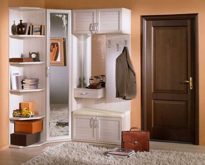 If there is a free corner in the hallway, it is possible to create a corner structure that will take over all the functional concerns. Of course, in Khrushchev buildings, the creation of such structures entails some difficulties, but there are also clear advantages in favor of such a solution.