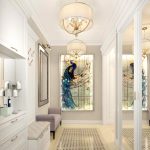 It is necessary to pay due attention to the lighting of the corridor. In a room lacking natural light, use wall lamps, sconces and chandeliers. Additional lighting fixtures will add coziness to the room, as well as visually expand the narrow corridor. A very important detail is the wall mirror. Thanks to reflections, the illusion of a space extending into the depths is created, which also adds light.