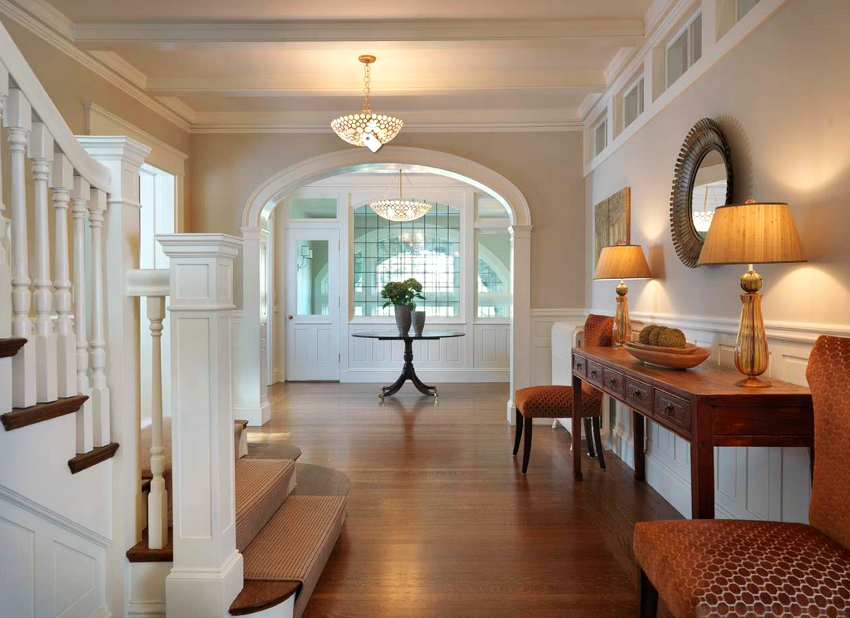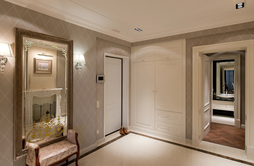 The use of architectural structures will help to add variety to the interior and dilute the monotony of smooth walls. Reliefs, cornices in the upper and lower parts of the wall will emphasize the sophistication of the hallway. Designers also advise to decorate doorways with frames that will give the interior geometry and emphasize an unusual architectural style.