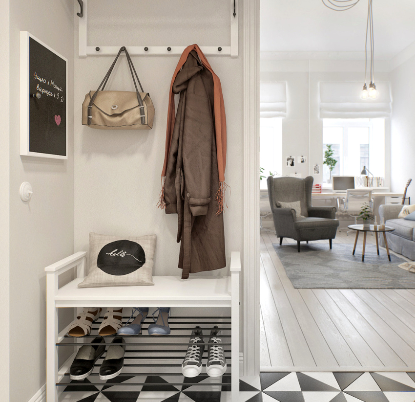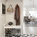 Since there is practically no free space in the hallway, each element must be multifunctional. Therefore, a small cabinet for keys and bags at the same time can be used to sort mail, and a small cabinet for storing shoes can serve as a chair for comfortable shoeing or taking off shoes.