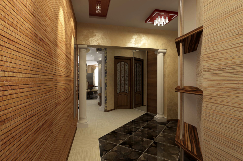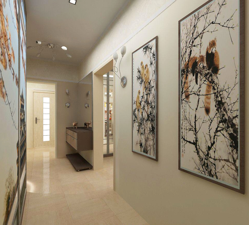 The proportions of the room can be smoothed out by correctly combining flooring, wall and ceiling decoration. To do this, you can hang a beautiful mirror on the long walls or stick photo wallpaper. This will help to adjust the interior volume of the hallway. Instead of interior doors, it is better to make arches in the doorways. It is better to use light colors for painting long walls, and dark colors for short ones. This design will visually make the room square.