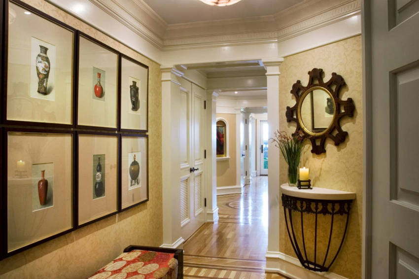Decor in the form of paintings and art objects is a good option for creating a chic hallway. Personal photos in fashionable frames look spectacular and stylish in the interior. You can decorate the room with figurines, music boxes, old rare books or objects that tell about hobbies or family history.