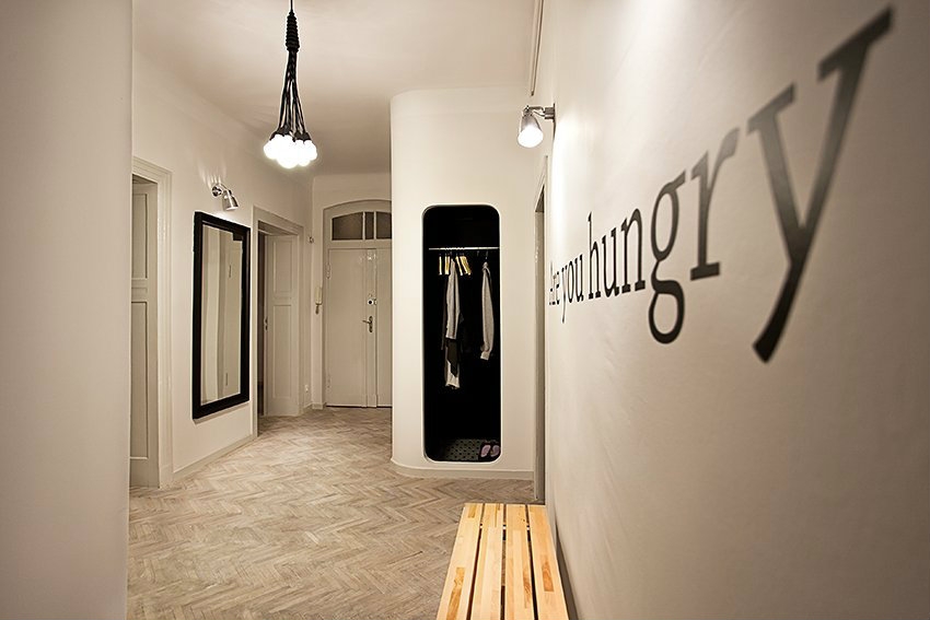 The corridor in an apartment building is usually small. Therefore, in such a room, you can usually only place a hanger and shelves for shoes. Accordingly, for a small hallway, a minimalist design is most suitable.