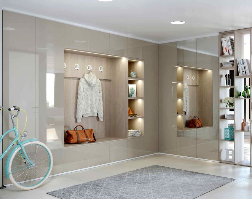 Neutral light colors are a great choice for hallway walls. A smooth transition to darker shades in the depths of the room will allow you to set the necessary accents. Glossy textured finishes can be used for perfectly smooth walls. This color, thanks to the reflections from the glossy coating, allows you to visually enlarge the hallway space.