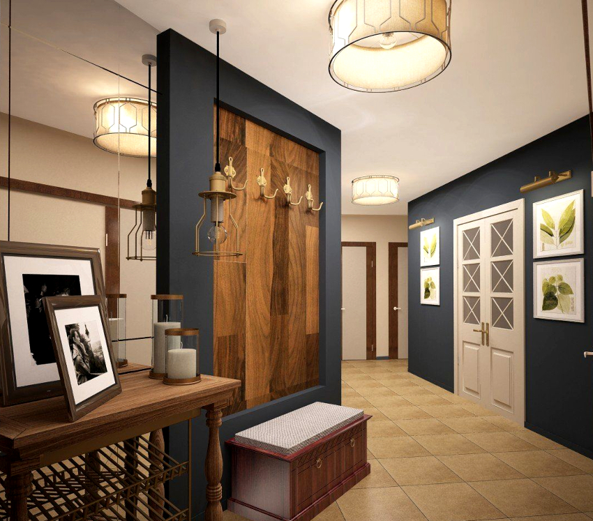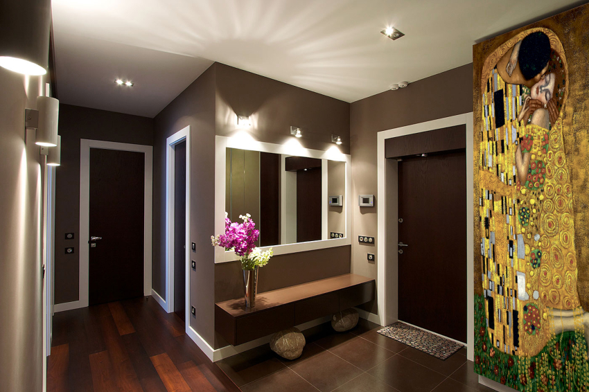 Special attention should be paid to lighting. Since the entrance hall in an apartment is a room without windows, there should be enough lighting fixtures so that the room does not look gloomy and dark like a cave.