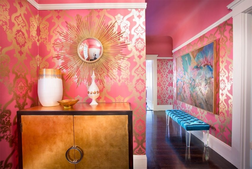 It's worth experimenting with warm colors too. They are not recommended for use in an apartment on wallpaper for a small corridor. Photos on the Internet, however, give examples of the opposite. To make such an interior look harmonious, it is worth adding mirror surfaces, contrasting in color and texture of the insert, or installing Spotlights.