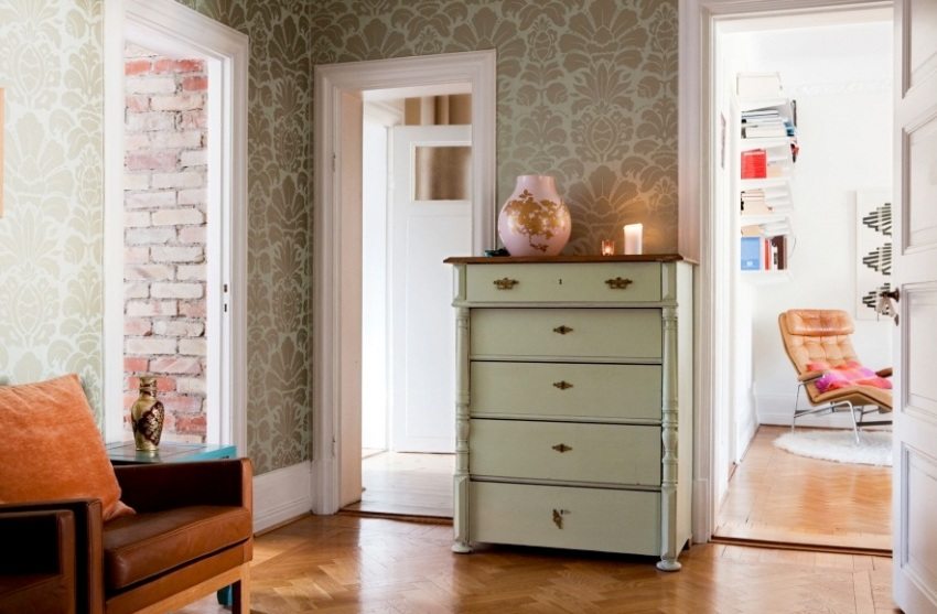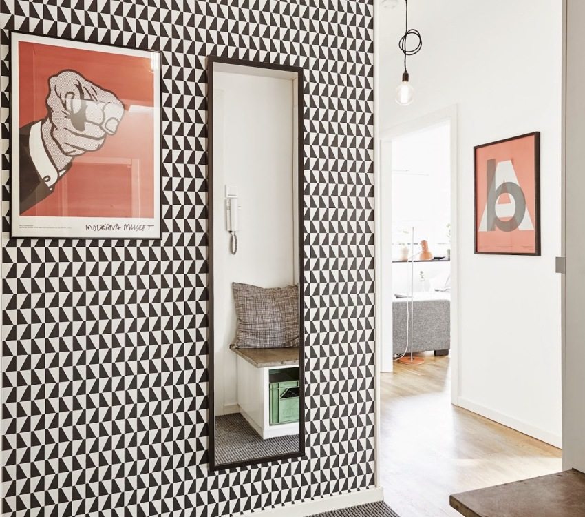 A photo of wallpaper for a small hallway in an apartment shows how stylish wallpaper with a small pattern looks here.