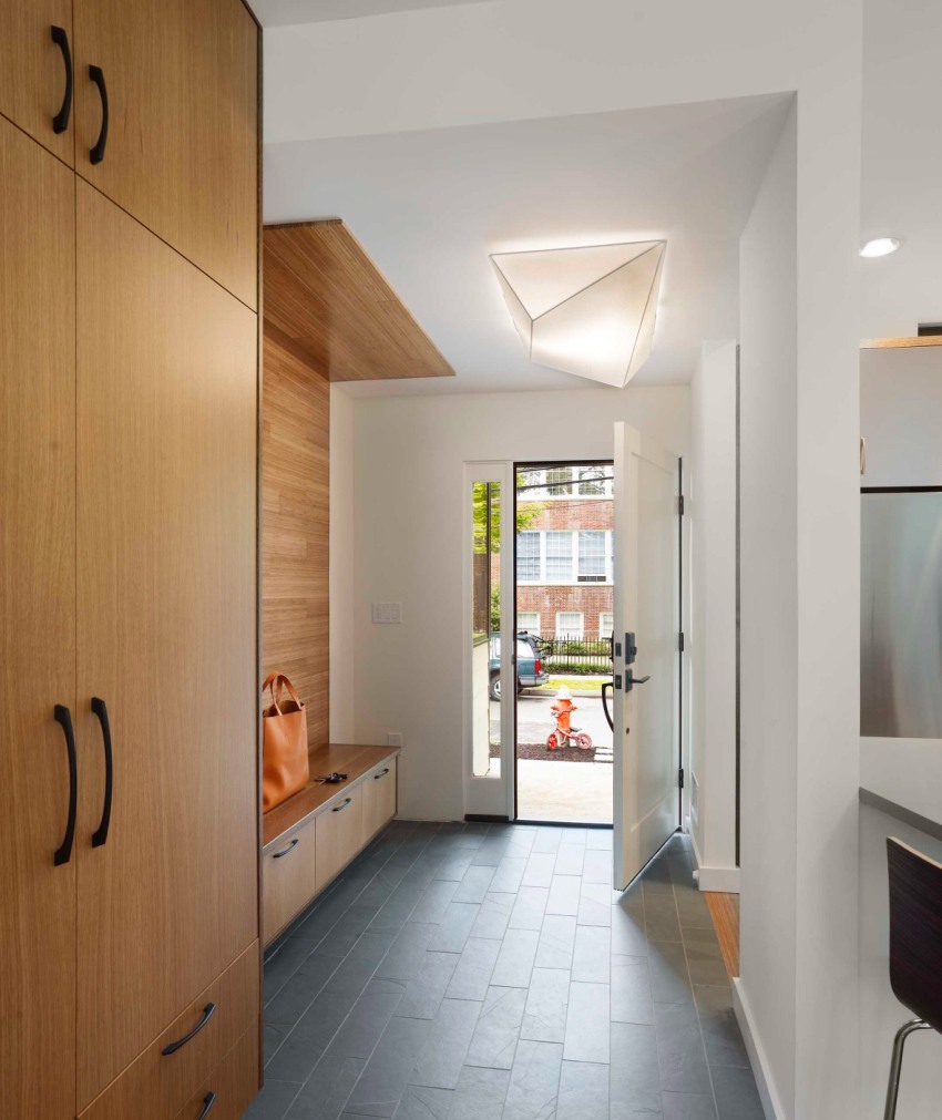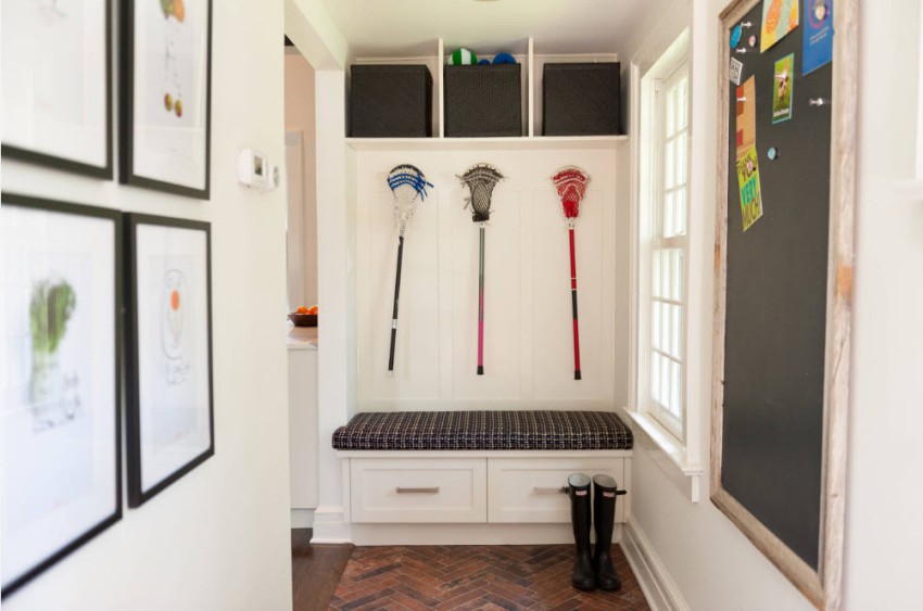 A narrow hallway can include hidden furniture that is mounted into the walls, this not only saves space, but also makes the corridor more convenient and functional