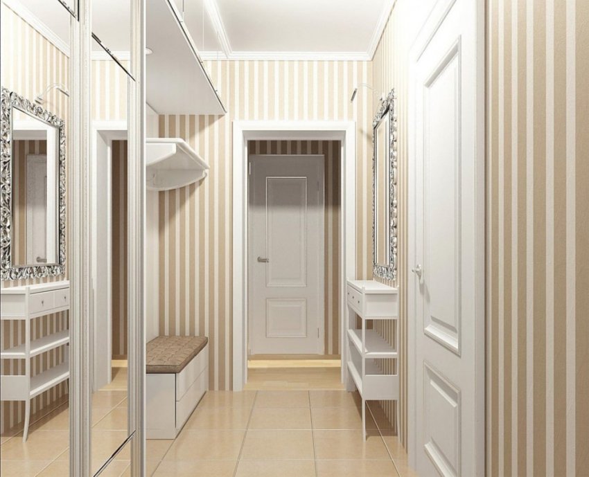 The mirror is a reliable assistant for visual enlargement of the space. For a long corridor, it is advisable to place it at the end of the room. It can hang on the wall or be part of the furniture.