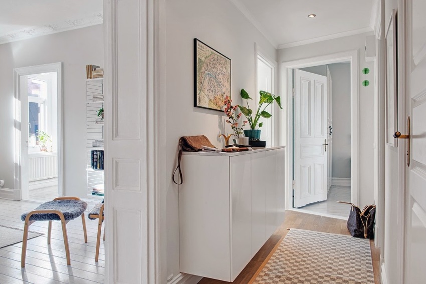 The corridor of a problematic narrow layout will not allow realizing fantasies and ideas, therefore it is preferable to install only a functional furniture