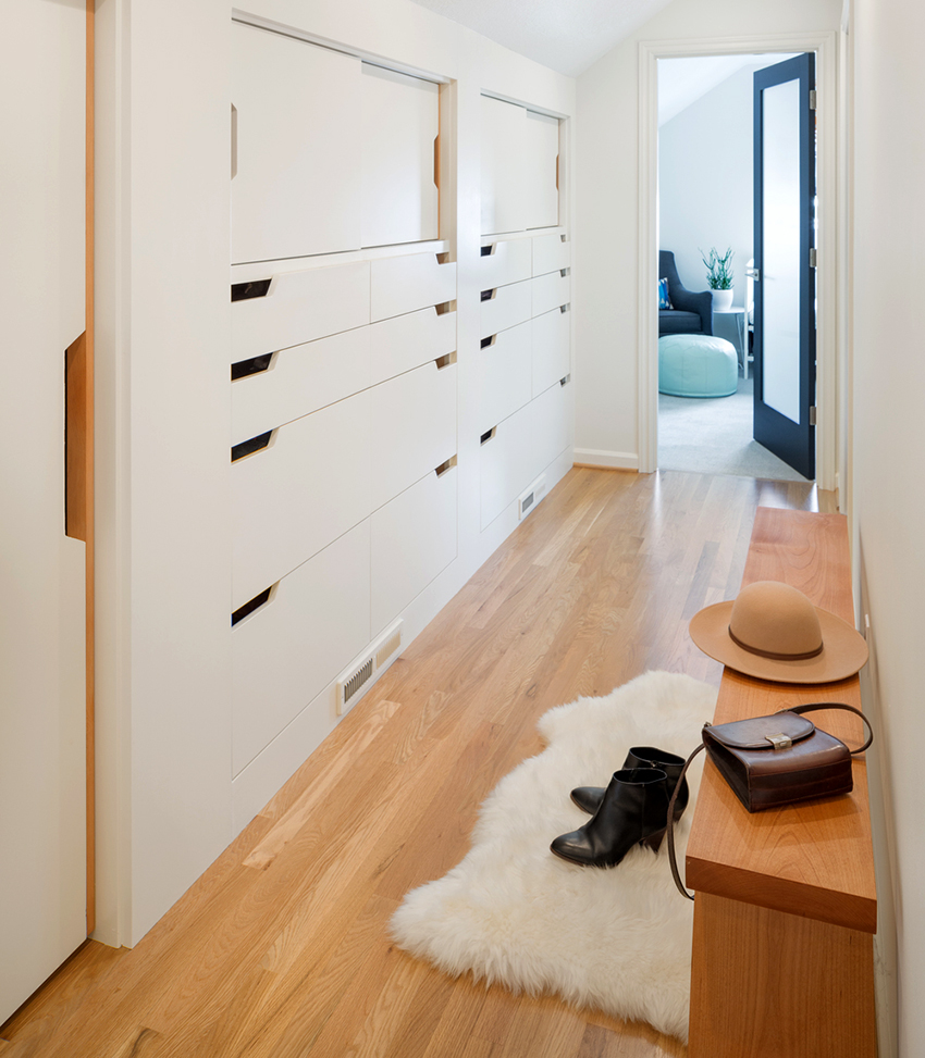 An ordinary hallway is perfectly transformed by installing a tiered shelf. The bench-like structure serves as a seating area, in addition, there is a compact storage niche under it.