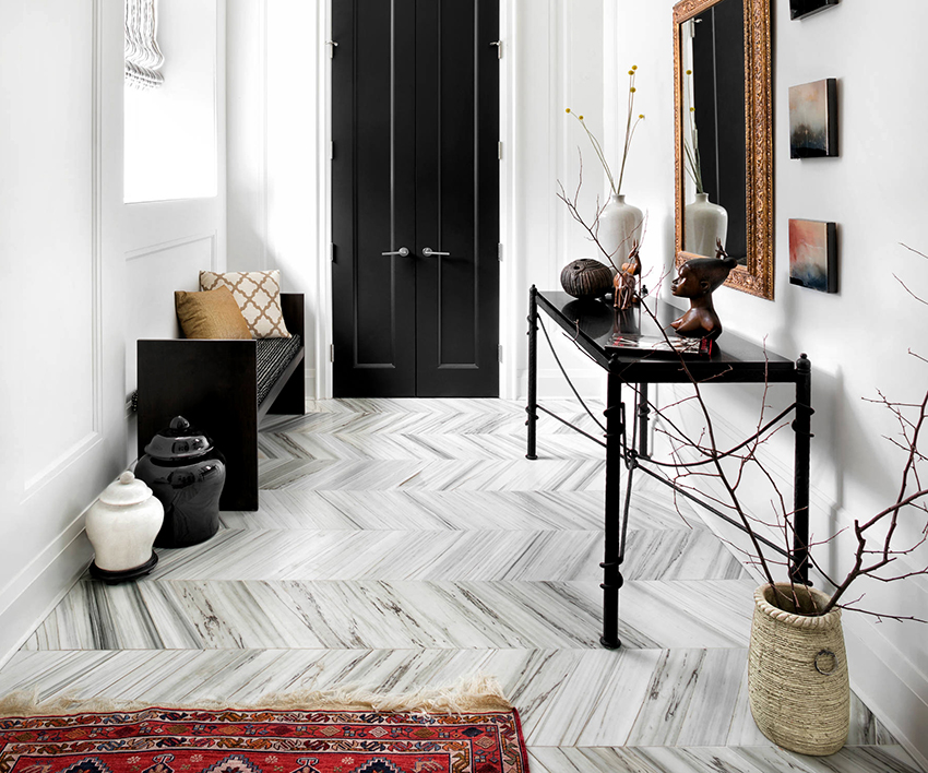For flooring, moisture-resistant finishing materials are best suited, for example, such as ceramic tiles, natural stone, special moisture-resistant types of laminate or linoleum. The surface color can be any. However, it must be borne in mind that a hallway with a dark floor will often need cleaning. At the same time, a light coating is also not a good option. Experts advise to pay attention to beige, gray and various variegated shades.