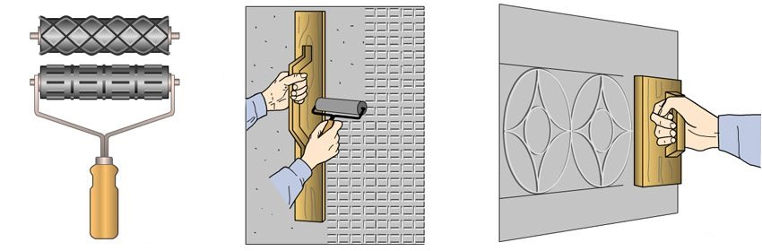 Homemade plaster is applied with a spatula with a layer of 3 mm. After the top layer has set, while the pliable mixture is still textured with the help of all sorts of improvised items. Crumpled polyethylene or paper, a sponge are good for this. If you want to get a large drawing, then pre-prepared stamps are used. This is how they make a brick texture. You can use rubber rollers on which patterns are applied. With a small soft spatula, you can create relief patterns with brush strokes.