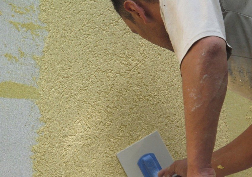 Recipe 5... For facades, you can prepare a mixture based on ordinary cement and river sand. Adding lime to it is allowed only in dry areas. The depth of the texture of the resulting coating depends on the fraction of sand. To prepare such a solution, you will need 1 part of white Portland cement M400 and 3 parts of river sand. Stirring is carried out, after which the mixture is diluted with water to a sour cream consistency. The decorative effect of such a solution is achieved by the peculiarities of its application to the surface. It is simply sprayed with a spray gun or long bristled brush by hand. The result is a coating that resembles the surface of a fur coat.
