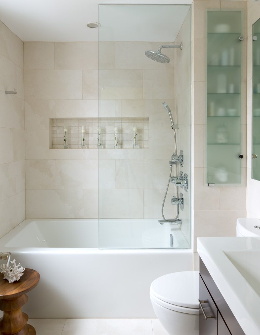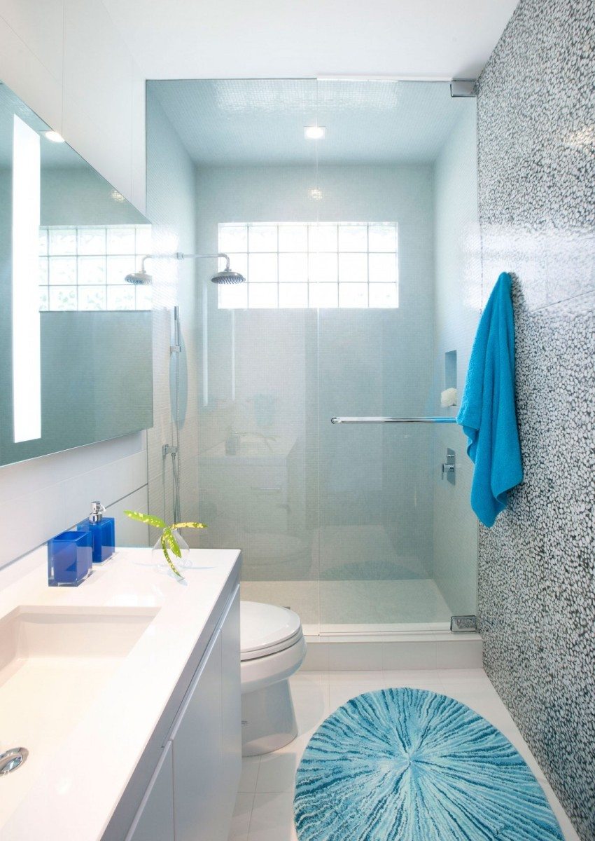 In a long and narrow bathroom, you can equip a shower area by blocking part of the room with a glass partition